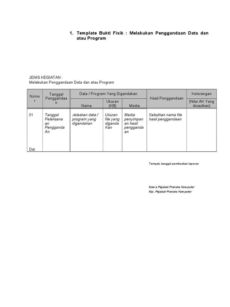 Catatan penggandaan data atau program (contoh pada lampiran 6). Melakukan penggandaan data dan atau program. Kelengkapan bukti fisik hasil kegiatan; Jabatan fungsional pranata komputer ahli dan angka kreditnya. Komputer mahir, pranata komputer ahli pertama, dan pranata komputer ahli.